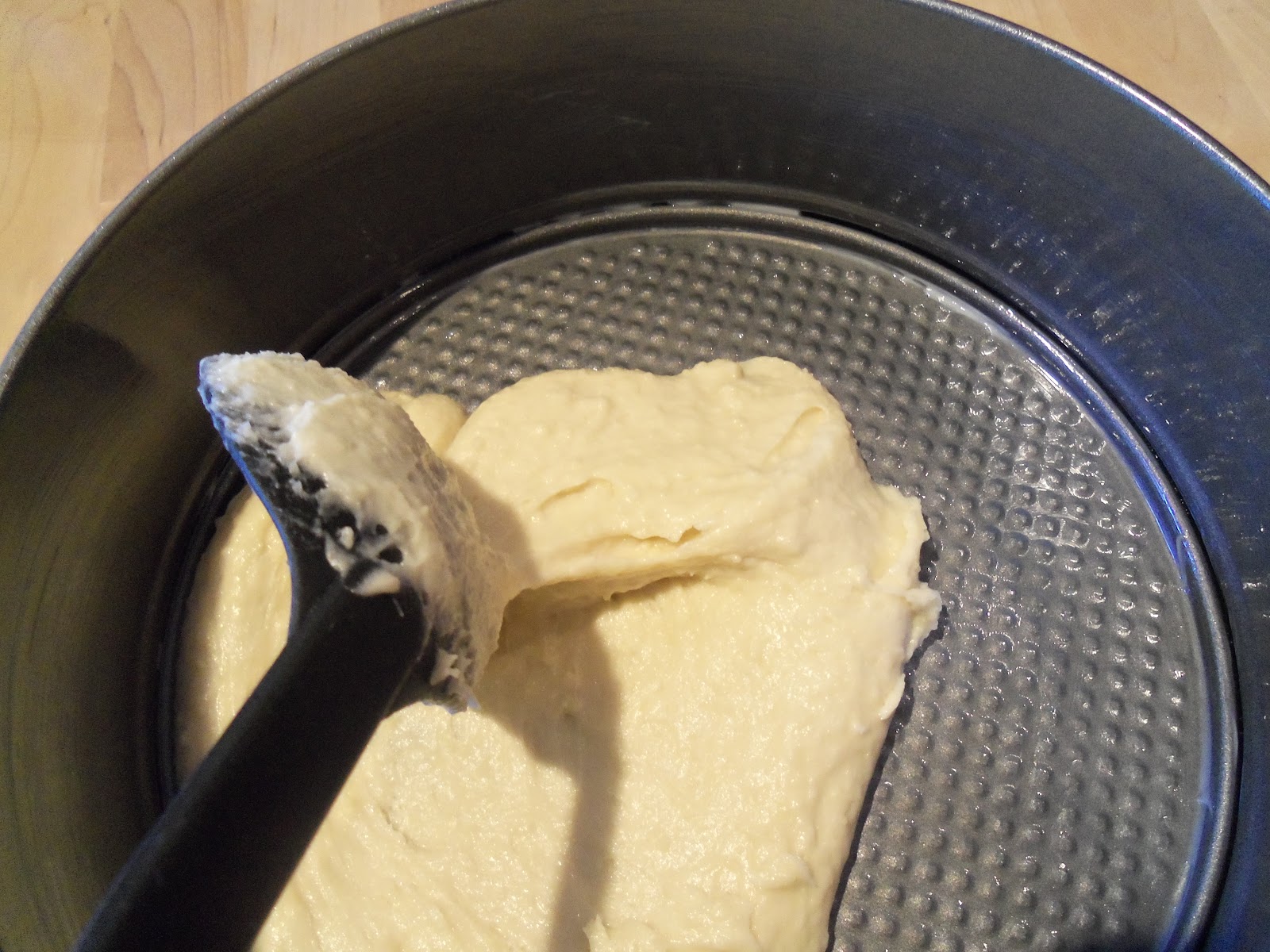 Aí o negócio pegou! Tinha que colocar metade dessa massa grudenta na forma e espalhar... E quem disse que foi fácil?!? Foi nada! Tive o maior trabalho pra espalhar tudo! Grudava na colher, saía da forma... Mas fui persistente e consegui! Ufa!